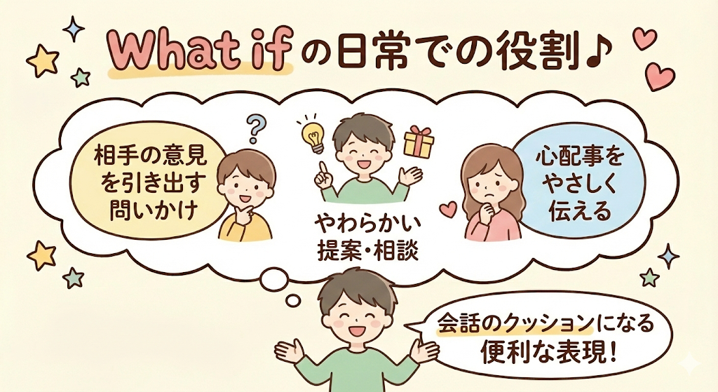 しかもwhat ifは、相手に「YESかNOか」を迫る感じが少ないのも特徴です。「どうかな?」くらいの温度感で出せるので、英語に自信がない時でも使いやすい表現です。