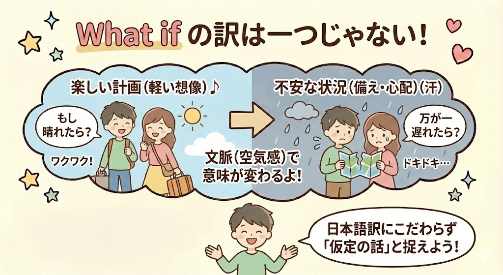 予定の相談なのか、アイデア出しなのか、それとも心配事なのか。その場面が分かれば、what ifの意味も自然に決まってきます。日本語訳を思い出すより、「想像の話をしているな」と受け取る方が、ずっとラクです。