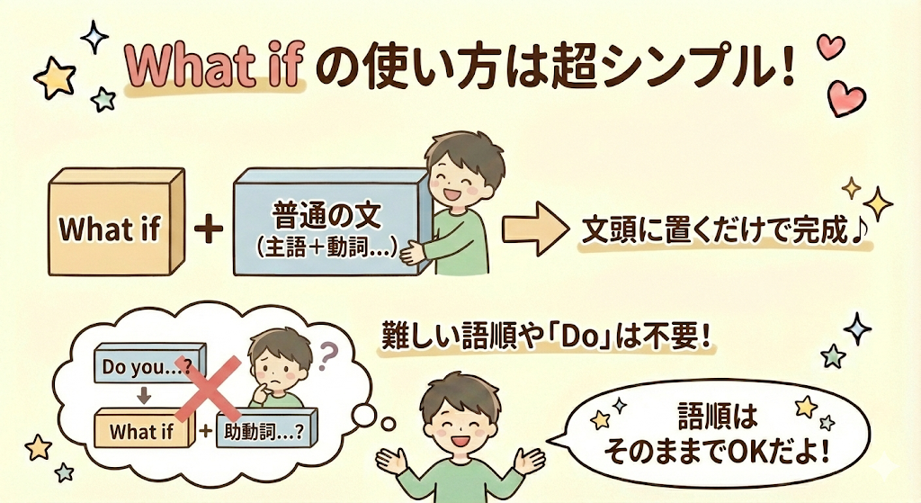 次の章では、さらに実践的に「どう使えばいいのか」を見ていきます。what ifは、基本的に文頭に置くだけでOKなので、ここから一気にラクになりますよ。