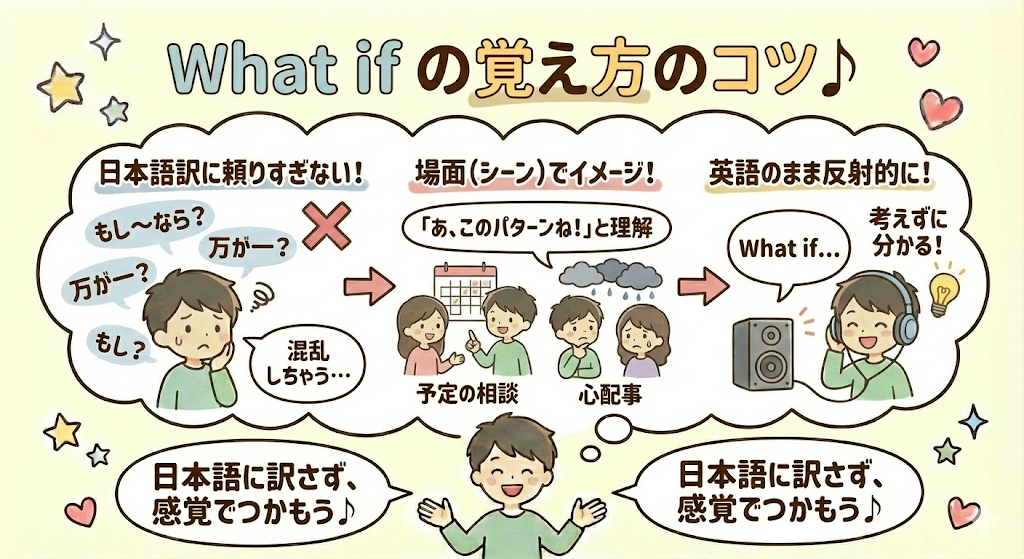 ここでは、日本語訳に縛られずにwhat ifを理解するための考え方を整理していきます。「覚える」というより、「慣れる」感覚に近い方法です。