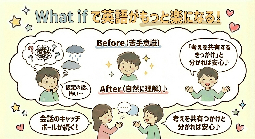 ここまで読み進めてきて、「what if いみ」に対する見え方が、最初とは少し変わってきたのではないでしょうか。意味を日本語で必死に考えなくても、場面から自然に理解できるようになると、英語そのものがぐっと身近に感じられます。