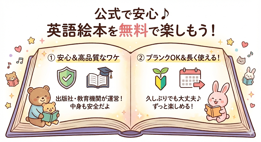 英語絵本を無料で楽しみたいと思ったとき、まず知っておきたいのが「公式サービスかどうか」という視点です。ネット上には英語絵本らしきものがたくさんありますが、出どころがはっきりしないものも少なくありません。その点、出版社や教育機関が運営している公式サービスなら、内容の質や安全面でも安心して使えます。ここでは、英語にブランクがあっても取り組みやすく、長く使える代表的な無料サービスを紹介していきます。