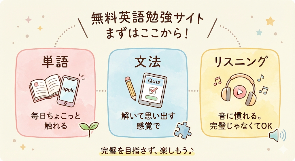 無料の英語勉強サイトといっても、いきなり全部をやろうとすると疲れてしまいますよね。大事なのは「まずどこを触るか」を決めてしまうことです。実は、無料サイトで効果を感じやすいのは、単語・文法・リスニングの3ジャンル。この3つを軽く回すだけで、英語に触れる感覚が戻ってきます。完璧を目指さず、まずは触る。その感覚を一緒につくっていきましょう。