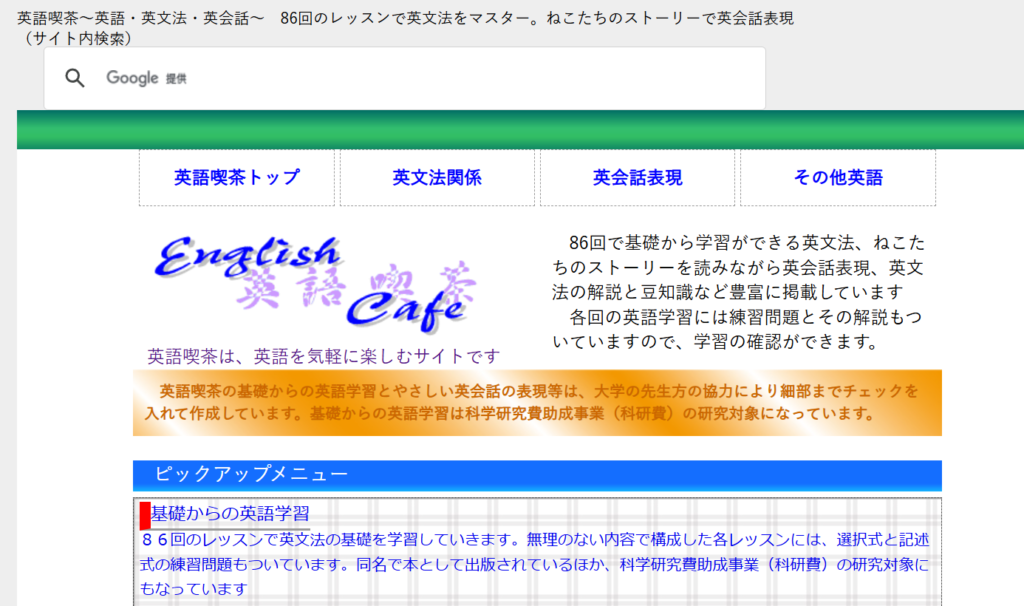 文法は「英語喫茶」で進めます。ここは日本語で丁寧に整理されていて、初学者でも迷いにくい構成です。英語の説明に圧倒される心配がないので、まずは安心してページを開けます。無料の英語勉強サイトを使うなら、“理解できる場所”から始めることがいちばんの近道です。