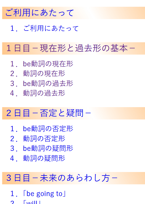 英語喫茶では、それぞれの単元が独立しているので、必要なところだけをピンポイントで見直せます。「分かっているつもり」を一度リセットして、最初から順に触る。それだけで、抜けていた部分が見えてきます。