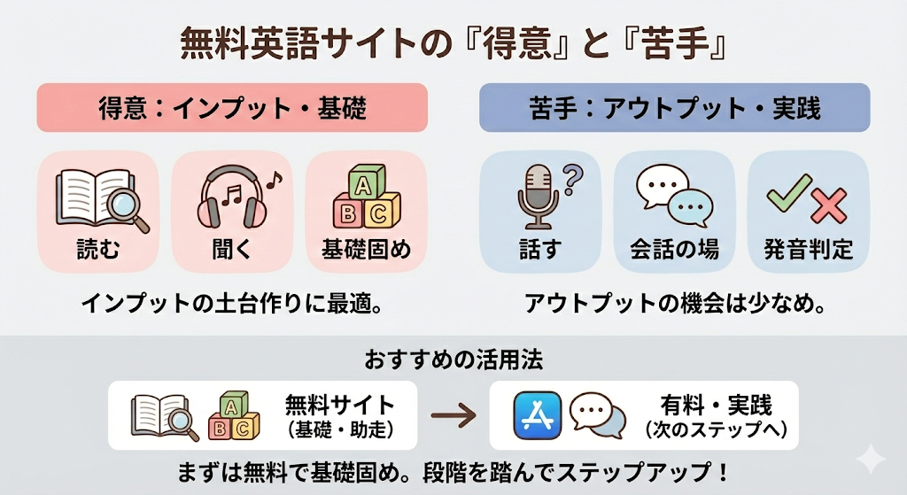 でも、これは悪い話ではありません。むしろ順番としては自然です。最初から話そうとしても、単語も文法も音も足りないと、しんどくて止まりやすいですよね。無料サイトでインプットの土台を作って、「ちょっと言えそう」「聞けそう」が増えてから、話す練習へ進む。この流れにすると、挫折が減ります。