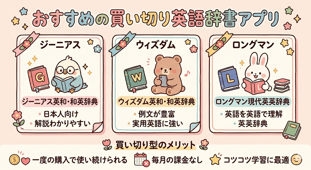 英語辞書アプリはたくさんありますが、長く使うなら買い切り型の辞書アプリがおすすめです。毎月の課金がなく、一度購入すれば追加料金なしで使い続けられるため、英語学習をコツコツ続けたい人に向いています。迷った場合は、次の3つから選ぶと失敗しにくいです。