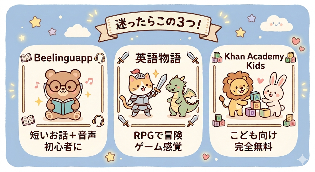 - 子ども向け → イラストや音声で楽しく学べるアプリ